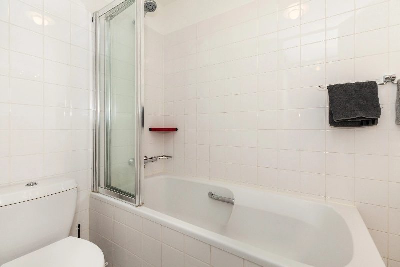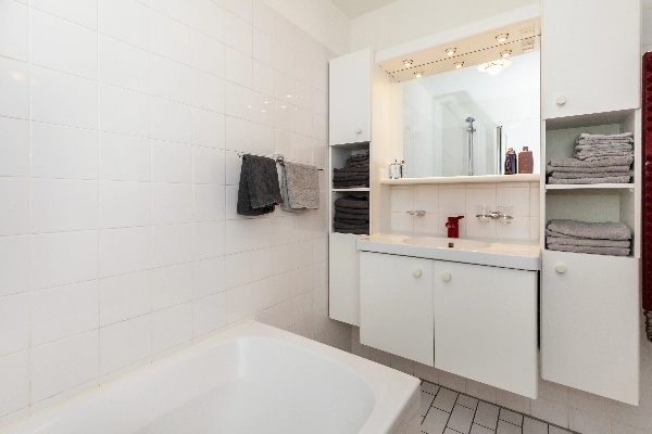 De badkamer is keurig betegeld in een frisse witte kleurstelling en voorzien van een ligbad met douchescherm en een groot wastafelmeubel.