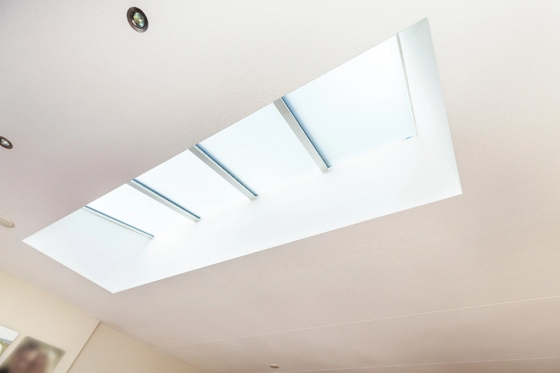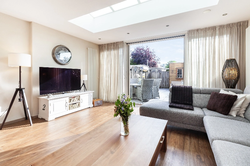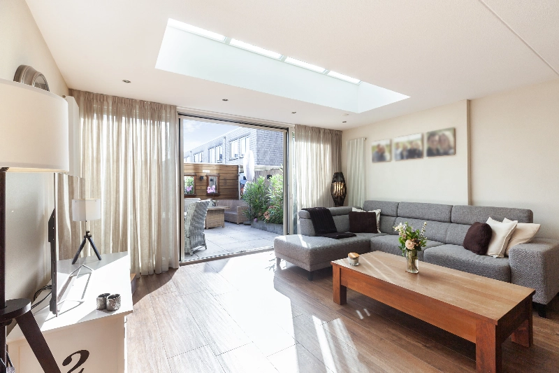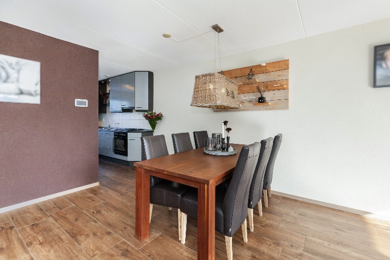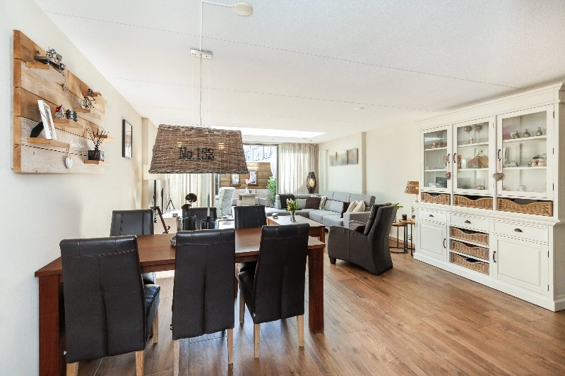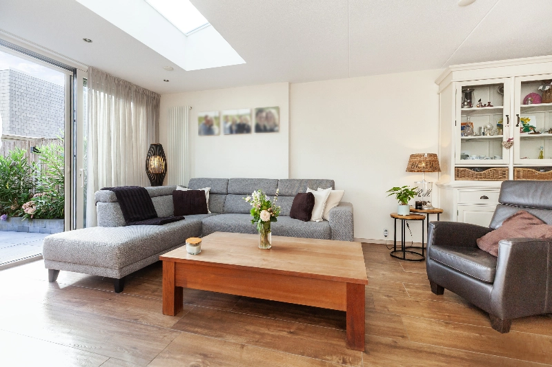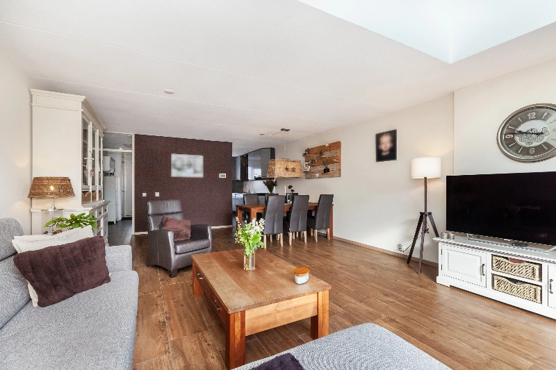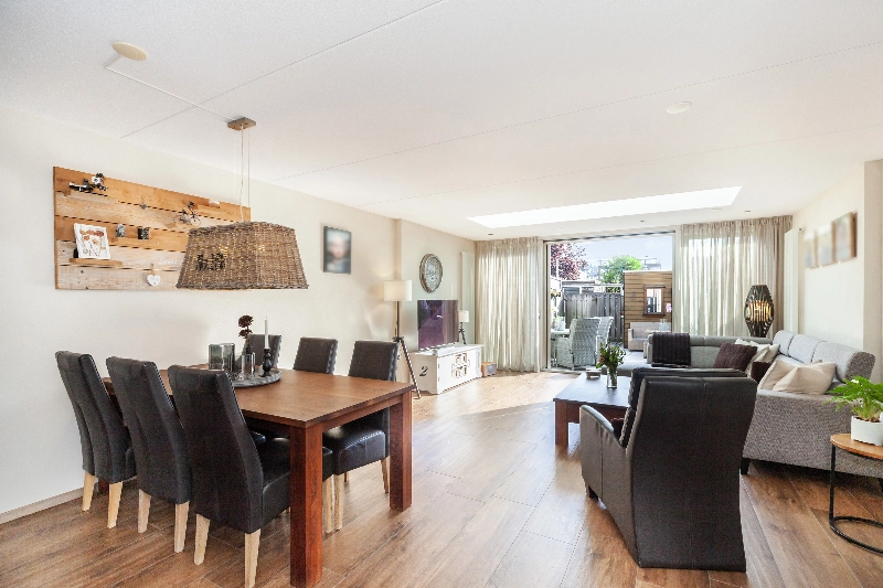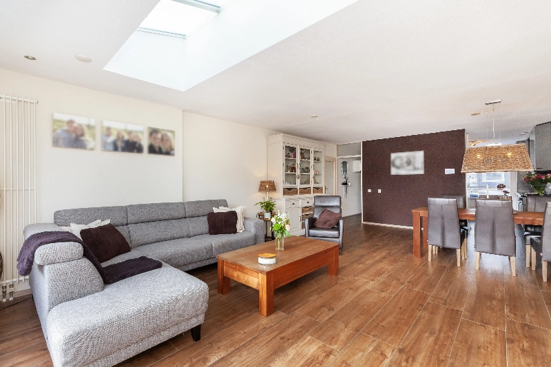 De uitgebouwde woonkamer is een echte eyecatcher: licht, ruim en voorzien van een prachtige lichtstraat en een grote schuifpui die zorgen voor een overvloed aan daglicht. De luxe keramische parketvloer met vloerverwarming loopt naadloos door in de hal en keuken. Het plafond is fraai afgewerkt met inbouwspots, wat de ruimte een moderne en sfeervolle uitstraling geeft.