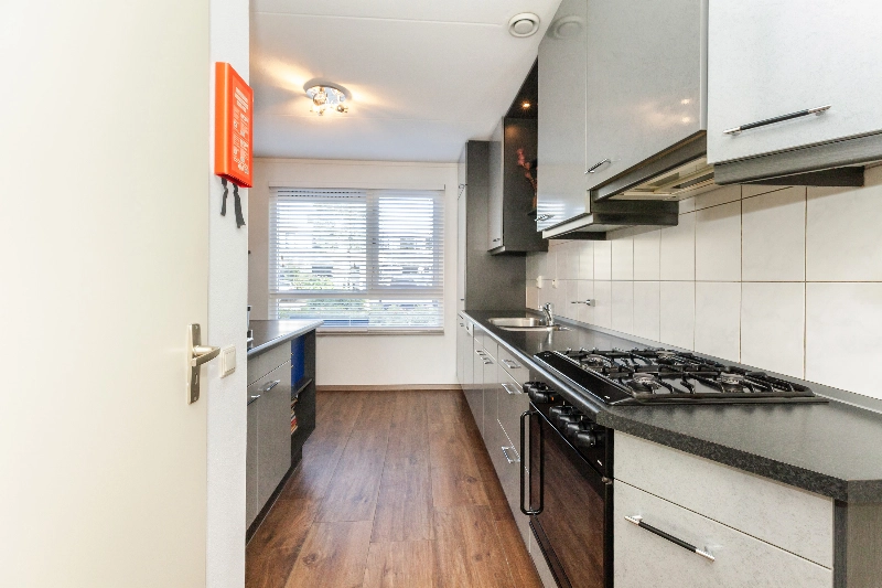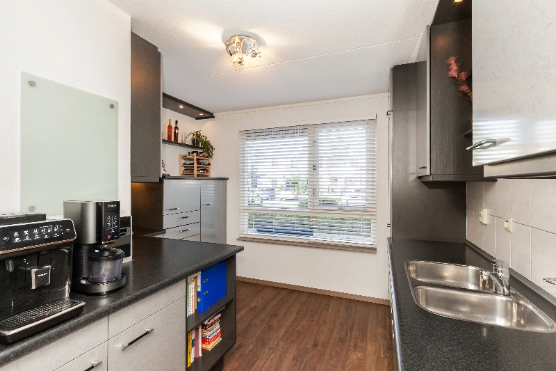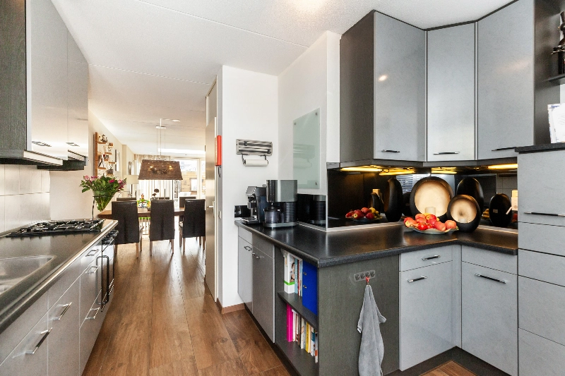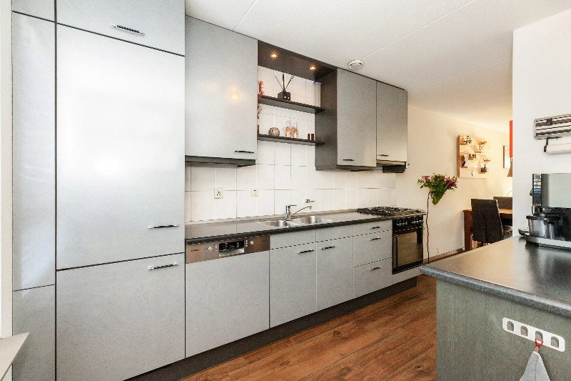 Aan de voorzijde van de woning ligt de royale keuken. Deze moderne keuken is uitgevoerd in het grijs met een zwart aanrechtblad en voorzien van een 4 pits gaskookplaat met vlakschermafzuigkap, een vaatwasser, een oven en een koel-/vriescombinatie. De handige trapkast is ideaal als extra bergruimte of proviandkast.
