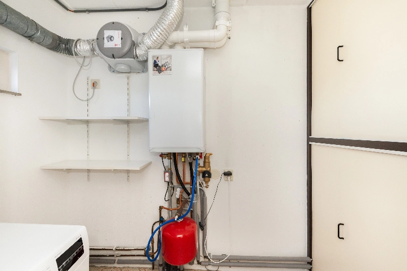 De grote wasruimte is functioneel ingedeeld met de aansluitingen voor wasmachine en droger, de opstelling van de c.v. combiketel (Intergas 2023), de unit van de mechanische ventilatie en een handige vaste schuifkast voor extra opbergruimte.