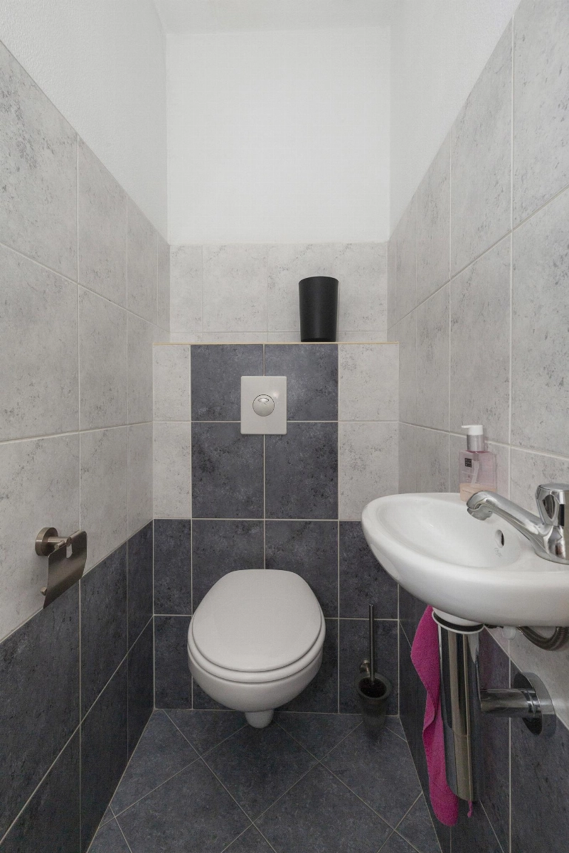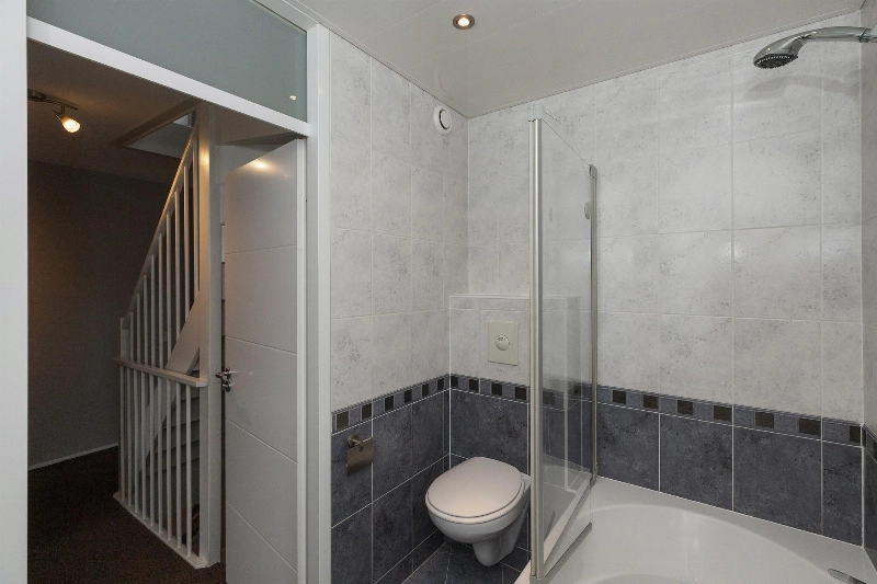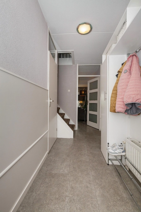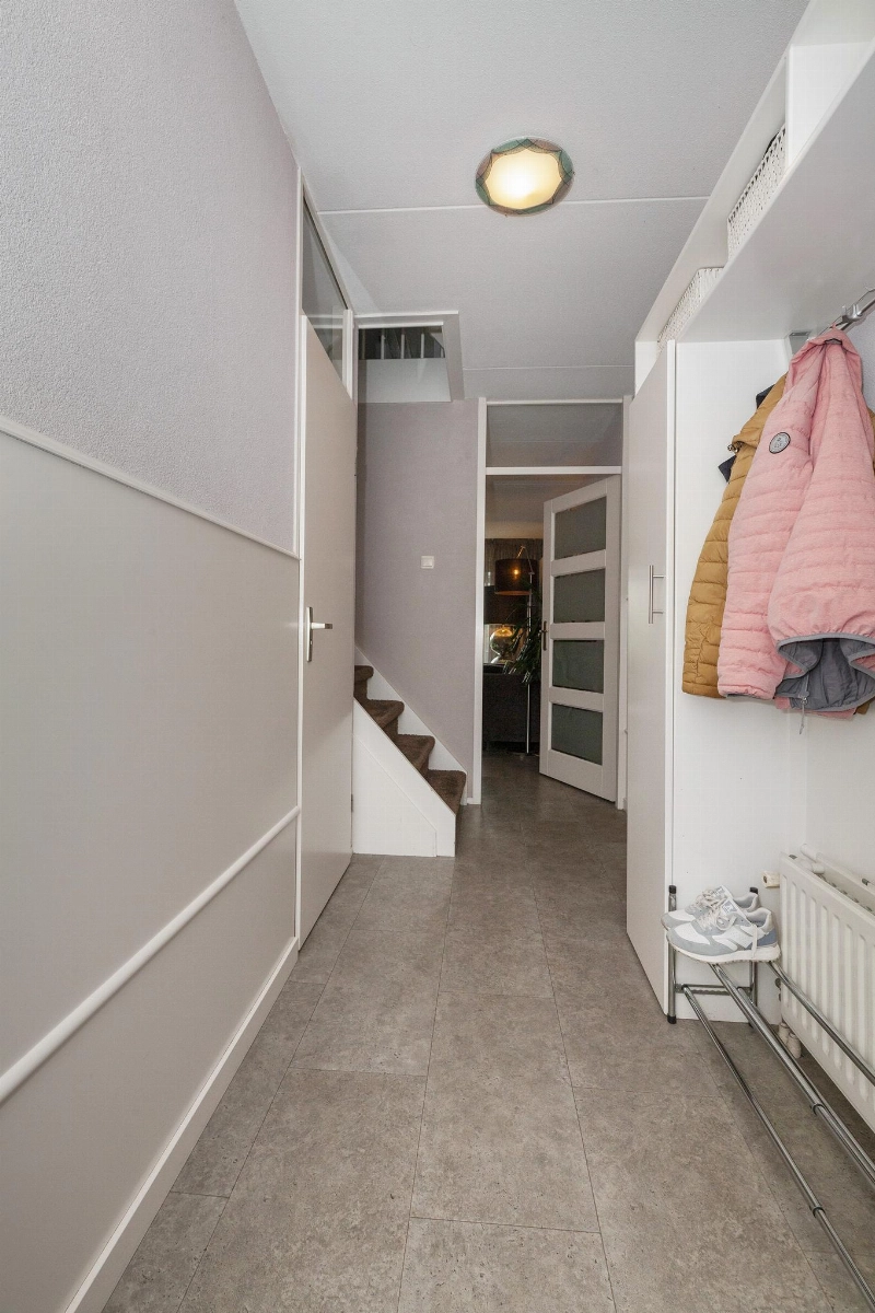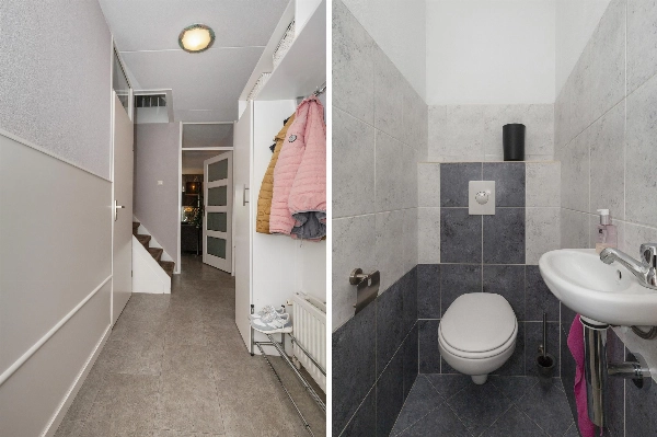 Via de keurige aangelegde voortuin (waar je overigens óók heel rustig buiten kunt zitten) bereik je de voordeur. Hier zie je meteen dat met aandacht gewoond wordt: de voordeur is prachtig en ook uitgevoerd in aluminium. Eenmaal binnen sta je in een ruime gang met garderobe, meterkast en trapopgang naar de 1e verdieping. Het toilet is gedeeltelijk betegeld toilet en voorzien van een zwevend closet en fonteintje.
