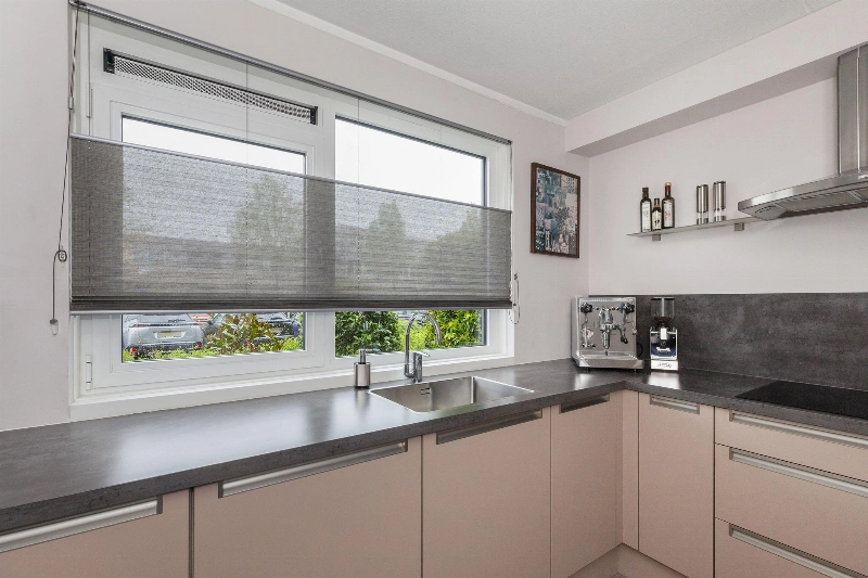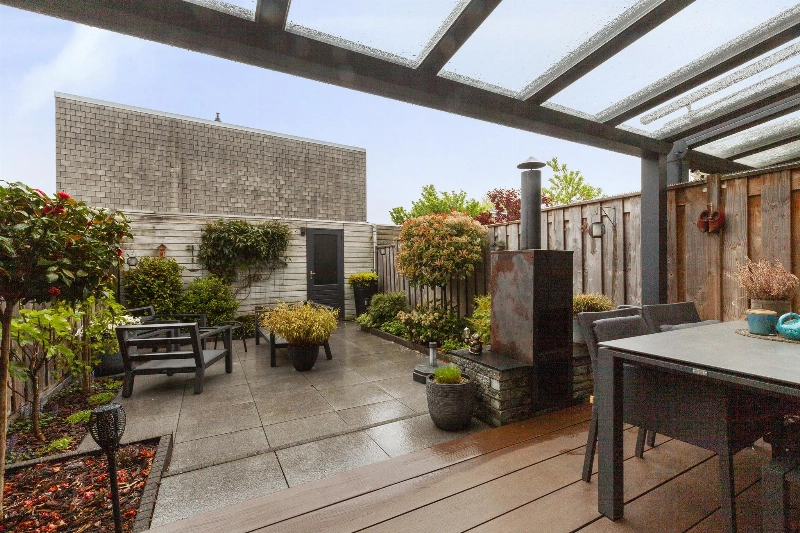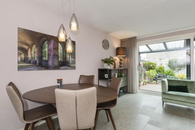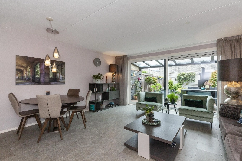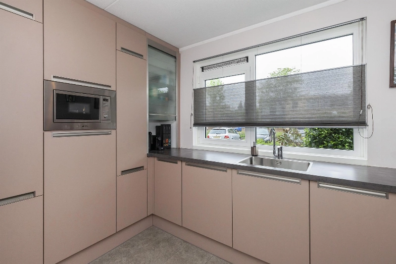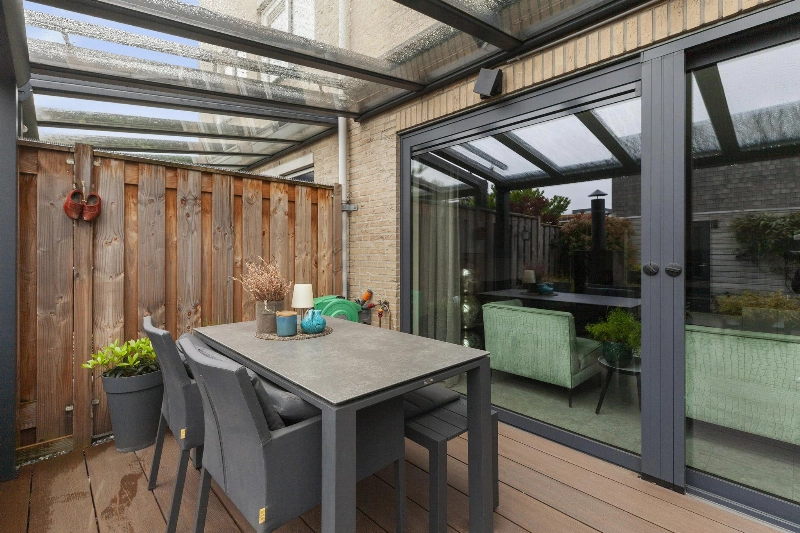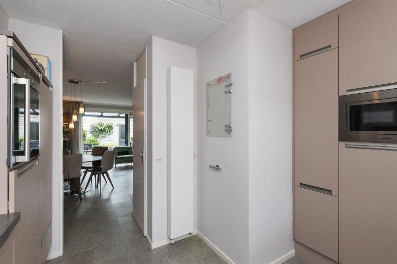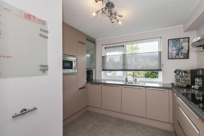 We lopen door naar de woonkamer. Wat een fijne, lichte ruimte! De brede schuifpui (met plisséhordeur) naar de tuin benadrukt dit nog eens. Deze woonkamer heeft een goede afmeting en staat in half open verbinding met de keuken aan de voorzijde. Deze is voorzien van een mooie Mocca-kleur U-opstelling. Vanaf 2019 is diverse apparatuur en het aanrechtblad vervangen. Zo vind je hier een vaatwasser, koelkast, vriezer, inductiekookplaat, afzuigkap, magnetron, oven en een boiler voor het warme water. Er is veel werkruimte in deze keuken! Maar wij geloven vast dat u tijdens de mooie zomerdagen veel gebruik zult maken van de tuin. Hier is namelijk een prachtige glazen overkapping gerealiseerd welke voorzien is van verlichting en een sunscreen. Dus steek de barbecue aan en genieten maar! De tuin is keurig aangelegden heeft in de zomermaanden van de ochtend tot einde middag zon. De houten berging is ruim en heeft een achterom naar de steeg.