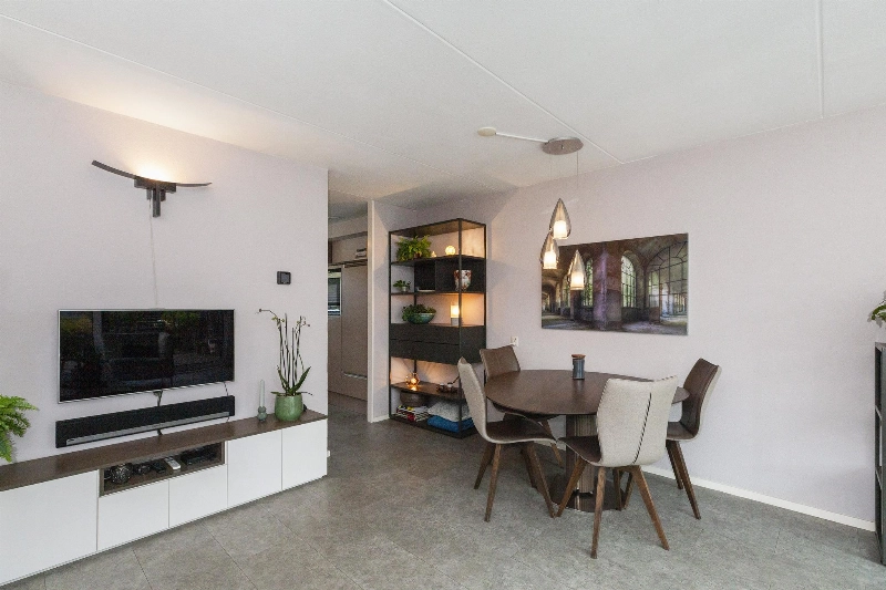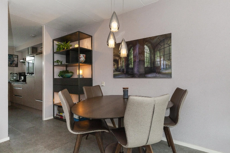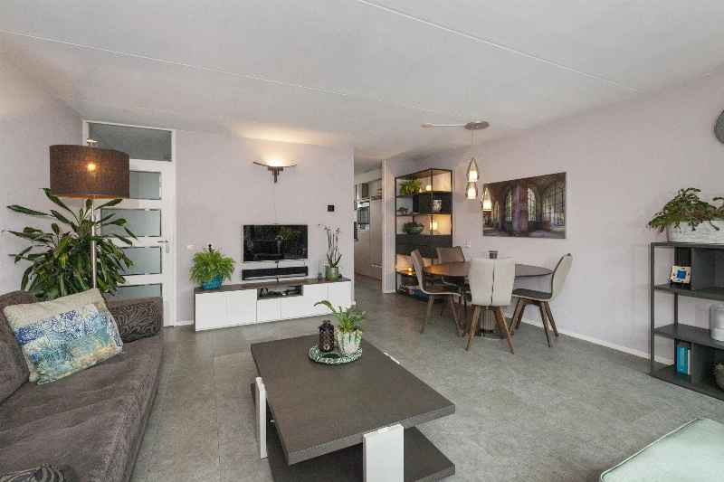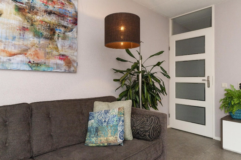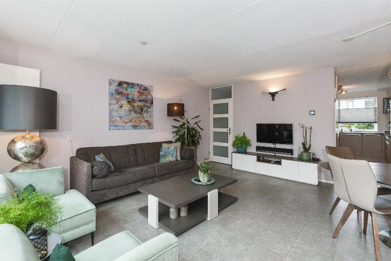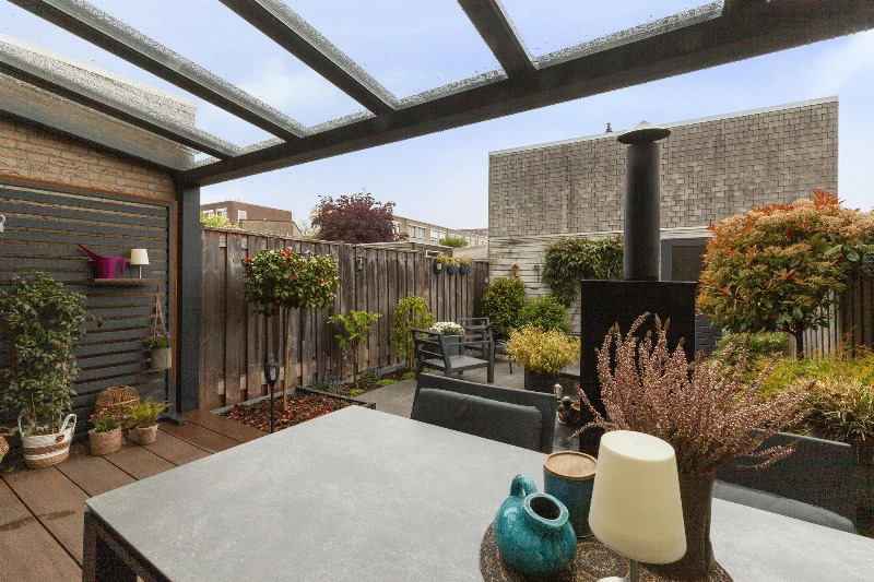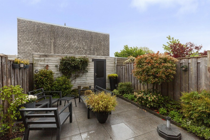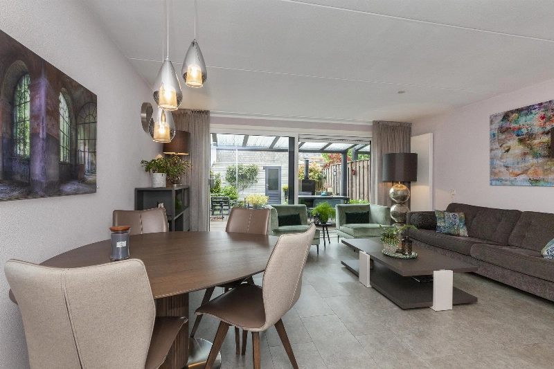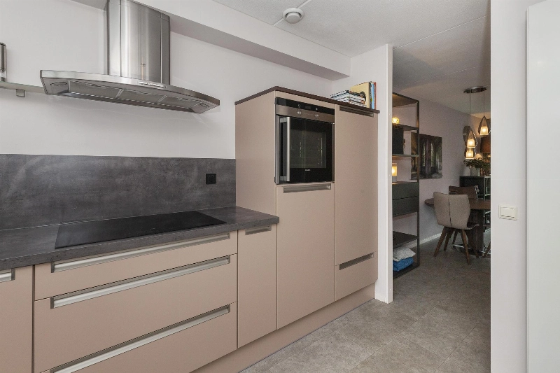 We lopen door naar de woonkamer. Wat een fijne, lichte ruimte! De brede schuifpui (met plisséhordeur) naar de tuin benadrukt dit nog eens. Deze woonkamer heeft een goede afmeting en staat in half open verbinding met de keuken aan de voorzijde. Deze is voorzien van een mooie Mocca-kleur U-opstelling. Vanaf 2019 is diverse apparatuur en het aanrechtblad vervangen. Zo vind je hier een vaatwasser, koelkast, vriezer, inductiekookplaat, afzuigkap, magnetron, oven en een boiler voor het warme water. Er is veel werkruimte in deze keuken! Maar wij geloven vast dat u tijdens de mooie zomerdagen veel gebruik zult maken van de tuin. Hier is namelijk een prachtige glazen overkapping gerealiseerd welke voorzien is van verlichting en een sunscreen. Dus steek de barbecue aan en genieten maar! De tuin is keurig aangelegden heeft in de zomermaanden van de ochtend tot einde middag zon. De houten berging is ruim en heeft een achterom naar de steeg.