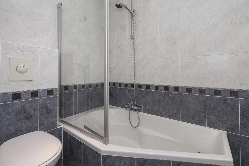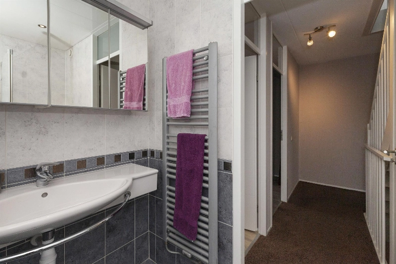 De speelse overloop geeft toegang tot de ruime badkamer. Deze is (net als het toilet) grijs gemêleerd betegeld en afgewerkt met een ligbad, wastafel met kastje, een 2e toilet en een radiator.