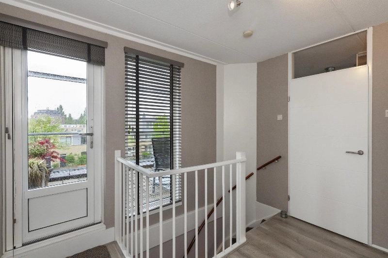 Ruime overloop met deur naar het dakterras gelegen op het westen. Wat een kadootje! Hier kan je vroeg in het jaar al genieten van het zonnetje. We gaan weer naar binnen...