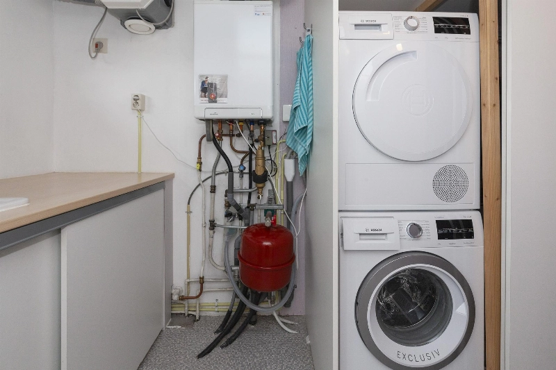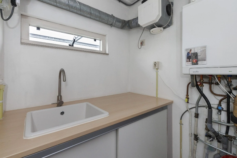 Fijne wasruimte aan de voorzijde met werkblad met kastjes en spoelbak met daaronder de opstelplaats voor de wasmachine en droger. Hier vind je ook de CV en de mechanische ventilatie.