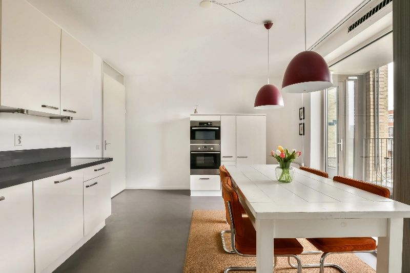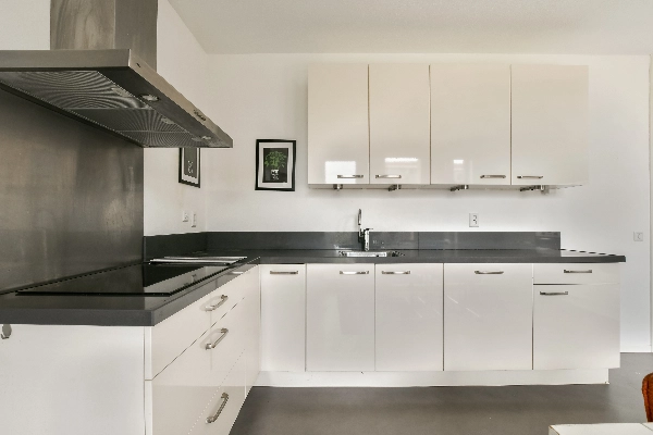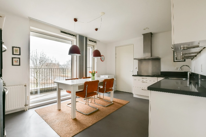 Aan de rechterzijde treft u de moderne, hoogglans witte keuken in L-vormige opstelling met een donker composiet aanrechtblad. De keuken is uitgerust met diverse inbouwapparatuur waaronder een inductiekookplaat met RVS afzuigkap en een vaatwasser. In het hoge kastengedeelte bevinden zich een koelkast, een oven en een combimagnetron. De grijze linoleumvloer geeft de ruimte een moderne uitstraling en de grote raampartijen zorgen voor veel licht en een prachtig uitzicht op het Nieuwlantpark. Dankzij de royale afmetingen mag deze ruimte met recht een woonkeuken worden genoemd.