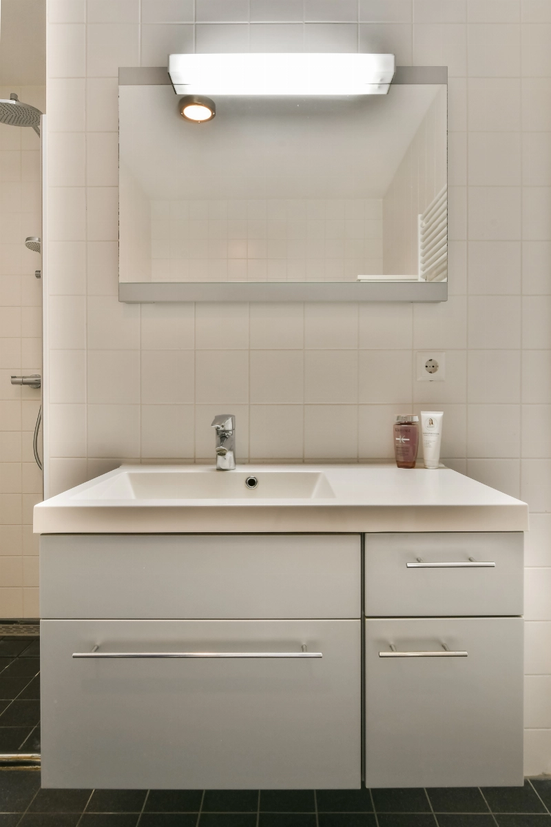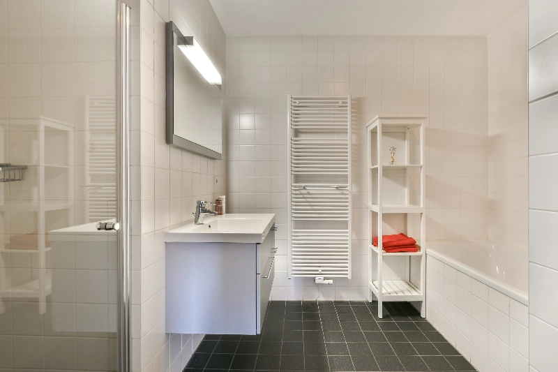De moderne badkamer is uitgevoerd met witte wandbetegeling en grijze vloertegels en beschikt over een douchehoek met glazen deur, een ligbad, een wastafelmeubel met verlichte spiegel en een handdoekradiator.