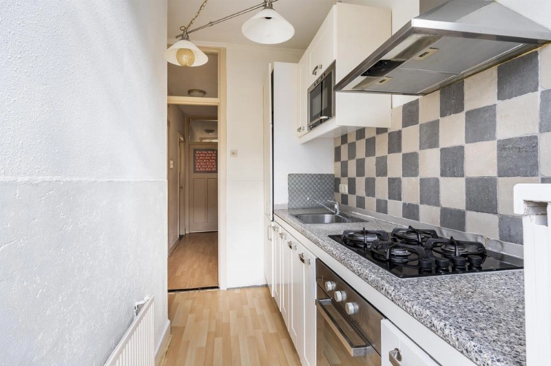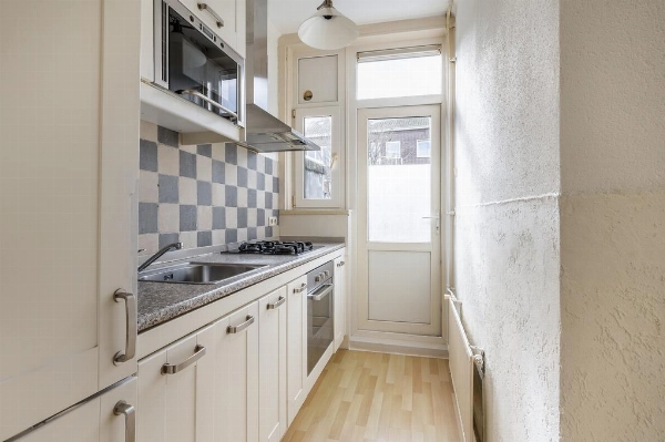 De keuken heeft een lichte opstelling en is voorzien van een 4 pits gas op glas kookplaat met een RVS afzuigkap, een oven, een magnetron en een koel-vriescombinatie.