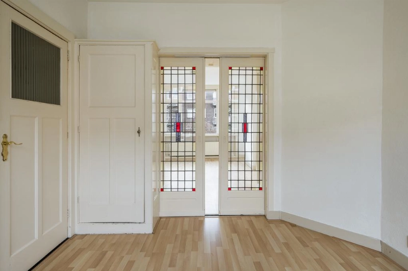 Sfeervolle woonkamer met een lichte laminaatvloer en een spachtelputz wandafwerking. Authentieke ensuite deuren met glas in lood brengen u in de gezellige eetkamer.