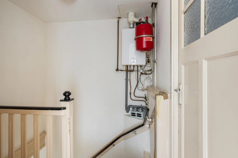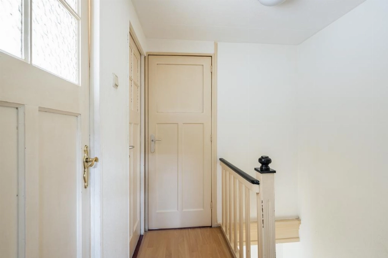 Ruime overloop met een lichte laminaatvloer welke doorloopt over de gehele verdieping. In het trapgat hangt de c.v. combiketel (Remeha Avanta 2014).