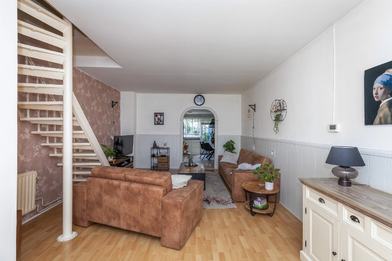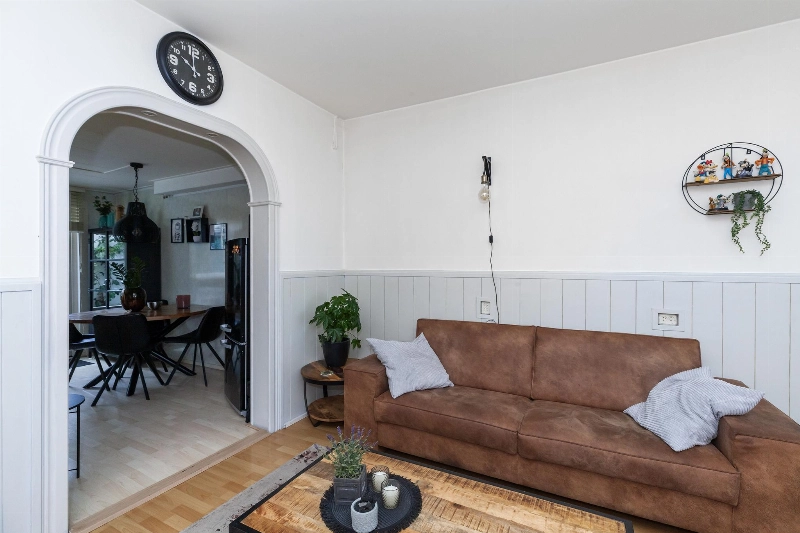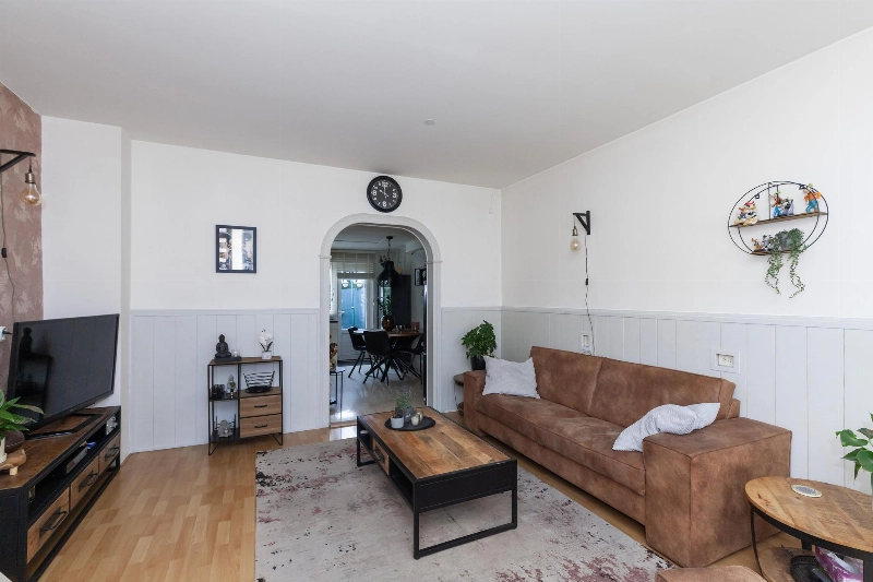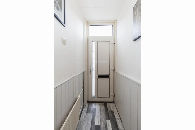 Via de entree kom je in de hal, die toegang biedt tot de woonkamer. De gezellige en ruime woonkamer is voorzien van een laminaatvloer en lambrisering op de wand.