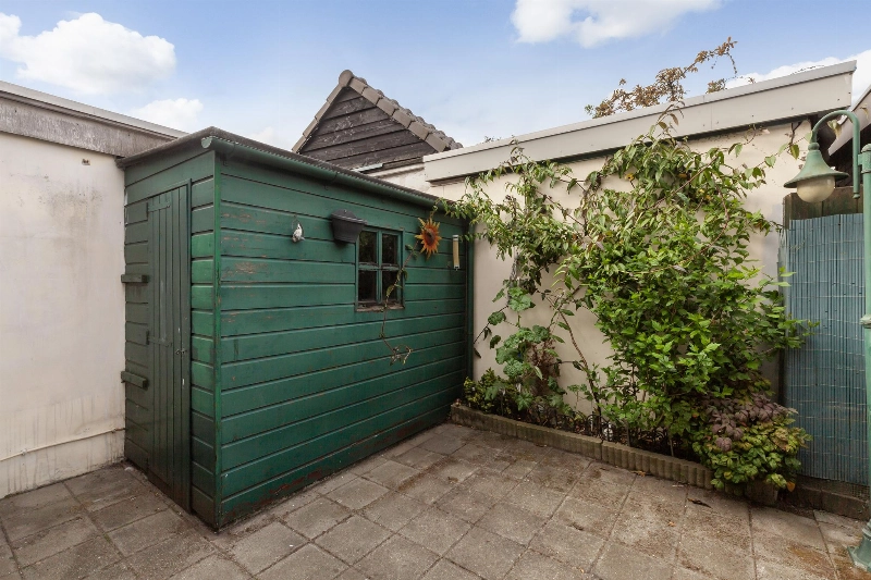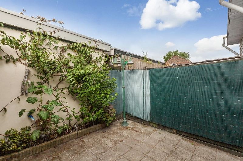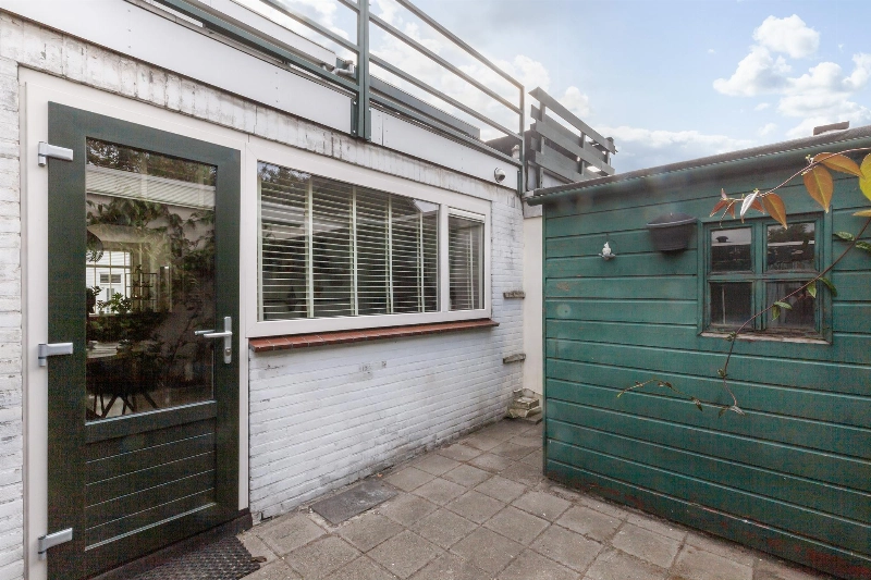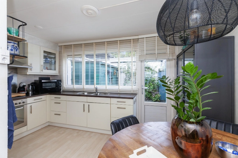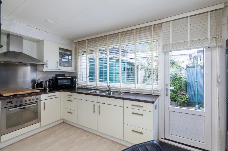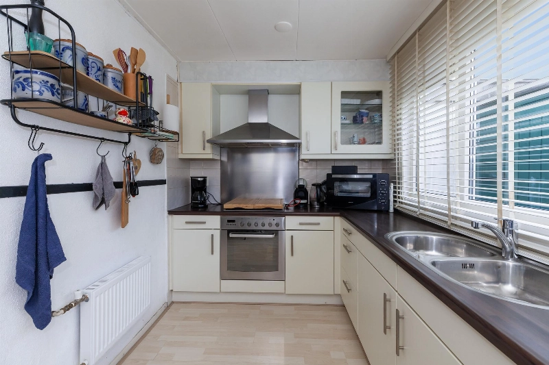 Vanuit de woonkamer loop je zo door naar de grote open keuken, die een L-vormige opstelling heeft in een crème kleur en is uitgerust met een 4 pits gaskookplaat met een afzuigkap. Een deur geeft toegang tot de gezellige stadstuin, waarin een houten berging staat, handig voor het opbergen van de fiets of het tuingereedschap.
