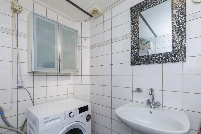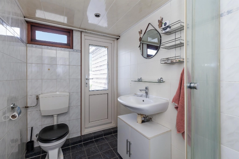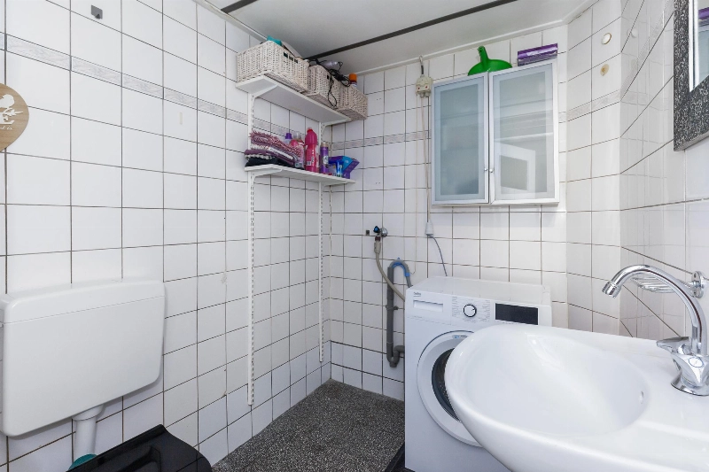 Direct naast de keuken is een ruim toilet met een duoblok, een wastafel en de aansluiting voor de wasmachine.