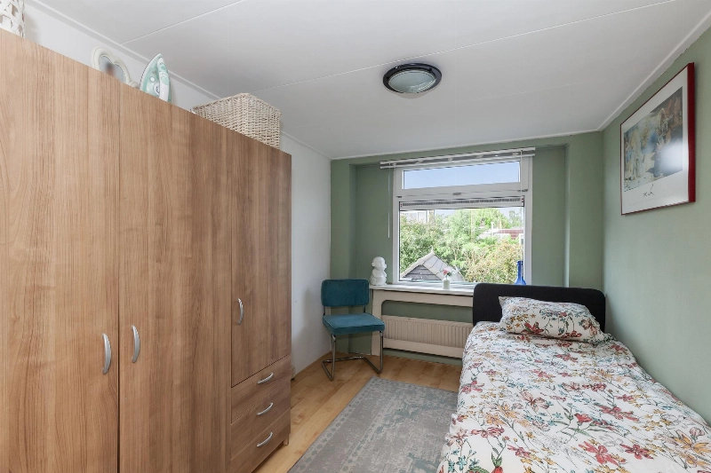 Aan de achterzijde van de woning bevindt zich een tweede slaapkamer met eveneens een kunststof kozijn met dubbele beglazing.