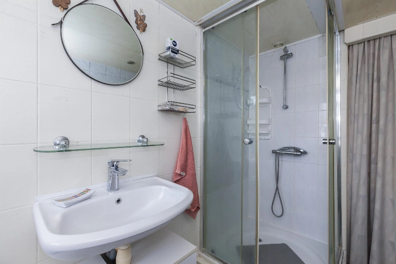 De badkamer heeft witte marmerlook wandtegels, zwarte vloertegels en beschikt over een douchehoek, een wastafel, een toilet en een kunststof kozijn met deur naar het platte dak.