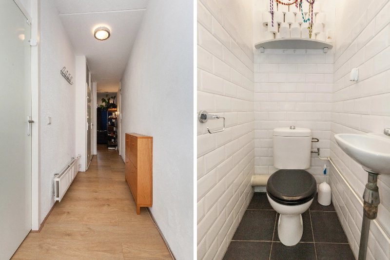 Entree, hal met meterkast, bergkast met opstelling van de c.v. combiketel en een nette afgewerkte toiletruimte met witte metro tegels, een duoblok en een fonteintje.