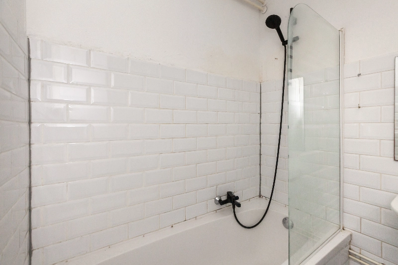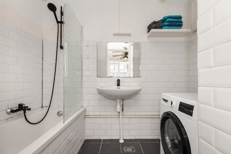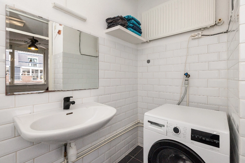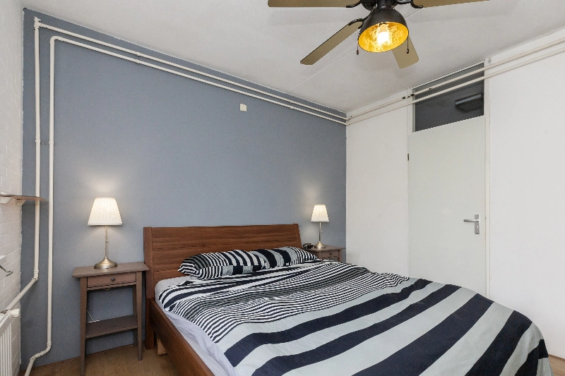 De slaapkamer ligt aan de galerijzijde en beschikt over een rolluik. Vanuit de slaapkamer is de badkamer te bereiken. Deze is afgewerkt met witte metrotegeltjes op de wanden en een zwarte vloertegel, en voorzien van een ligbad, een wastafel, een radiator en de aansluiting voor een wasmachine.