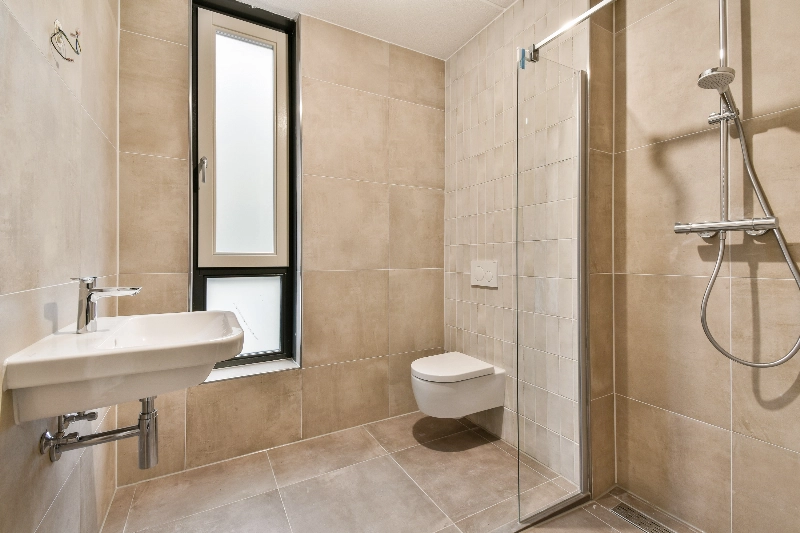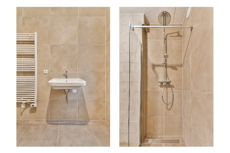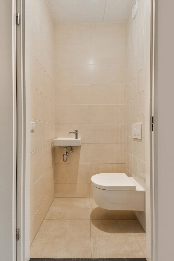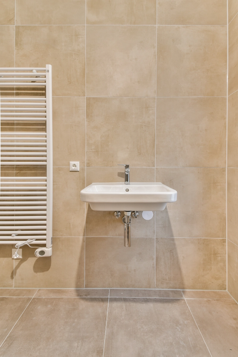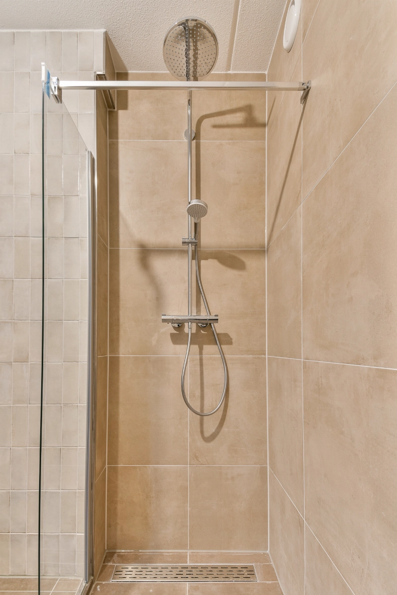 De badkamer is geheel luxe betegeld met een zandkleurige 60x60 tegel en is afgewerkt met een inloopdouche met drain, 2e toilet, wastafel, handdoekenradiator en het raam met folie zorgt voor zowel daglicht als de gewenste privacy. Achter het toilet is bovendien een stijlvolle accenttegel in een bijpassende zandtint aangebracht.