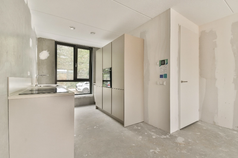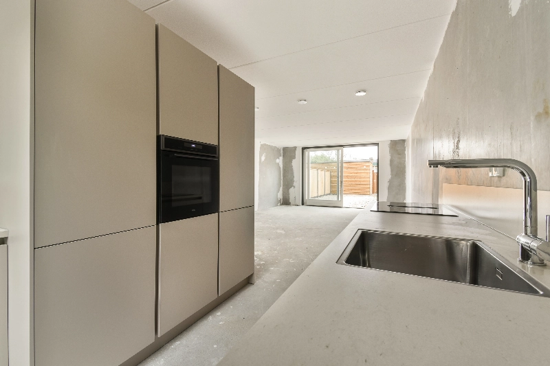 De woonkamer is ruim en heeft een schuifpui naar de ruime achtertuin en aan de voorzijde staat de gloednieuwe keukenopstelling. Deze is uitgevoerd in een moderne, zachte leemkleur en heeft een opstelling aan beide kanten. Een grote raampartij zorgt hier voor volop natuurlijk licht.