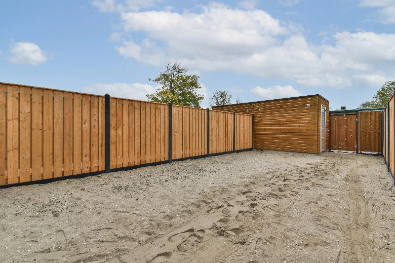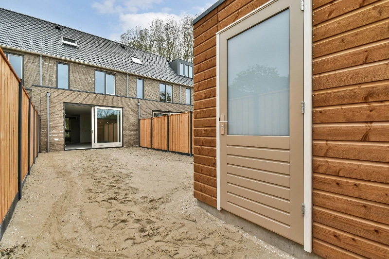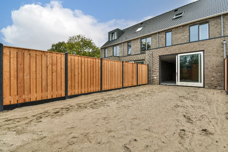 De woonkamer is direct met 2.4m aan de achterzijde uitgebouwd waardoor een ruime woonkamer is ontstaan! Deze heeft een trapkast met verdeler voor de vloerverwarming en een brede schuifpui naar de tuin. Deze achtertuin is reeds afgegraven en voorzien van zand. De schuttingen zijn recent geplaatst en er is een elektra- en wateraansluiting aanwezig.