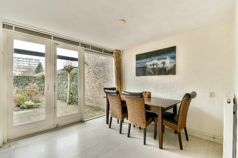 Aan de achterzijde van de woning ligt de verzorgde woonkeuken in frisse witte uitvoering. Dankzij de royale opzet is er meer dan genoeg ruimte voor een grote eettafel waar u met familie en vrienden uitgebreid kunt tafelen. Via de dubbel openslaande deuren stapt u zo de zonnige, op het zuidwesten gelegen tuin in.