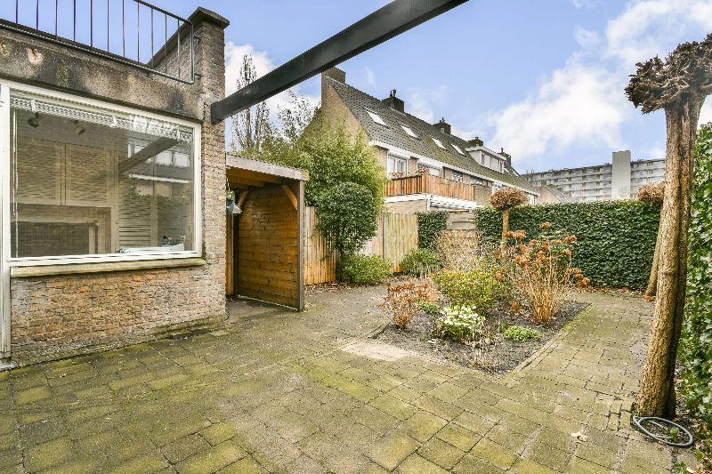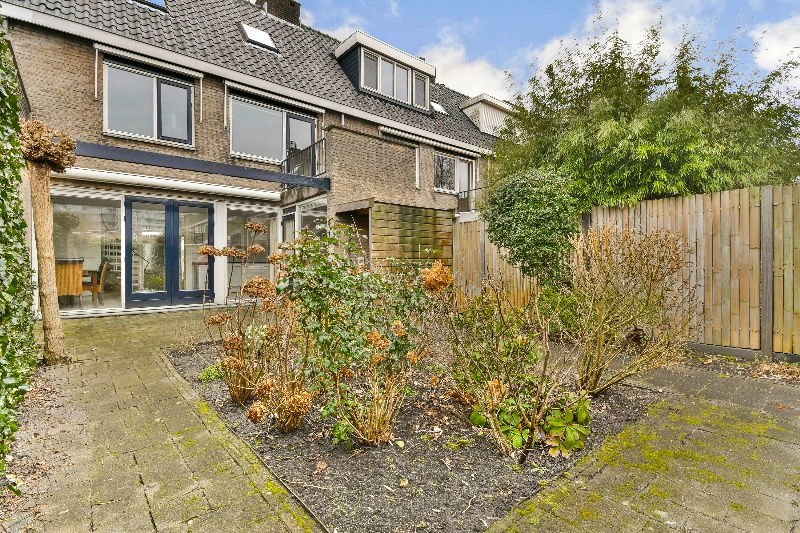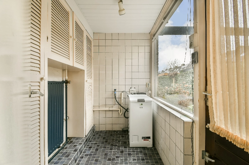 Aan de achterzijde van de woning bevindt zich de keurige hoekkeuken met een losse vaatwasser en een keramische kookplaat. Aansluitend treft u de bijkeuken met extra opbergruimte en de aansluiting voor een wasmachine. De vloer in de woonkeuken is voorzien van een lichte tegelvloer. Via dubbele deuren bereikt u de zonnige achtertuin met grijze bestrating, een kleine overkapping voor de fietsen en een achterom.