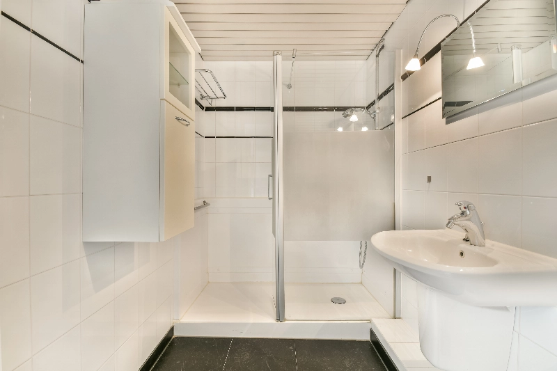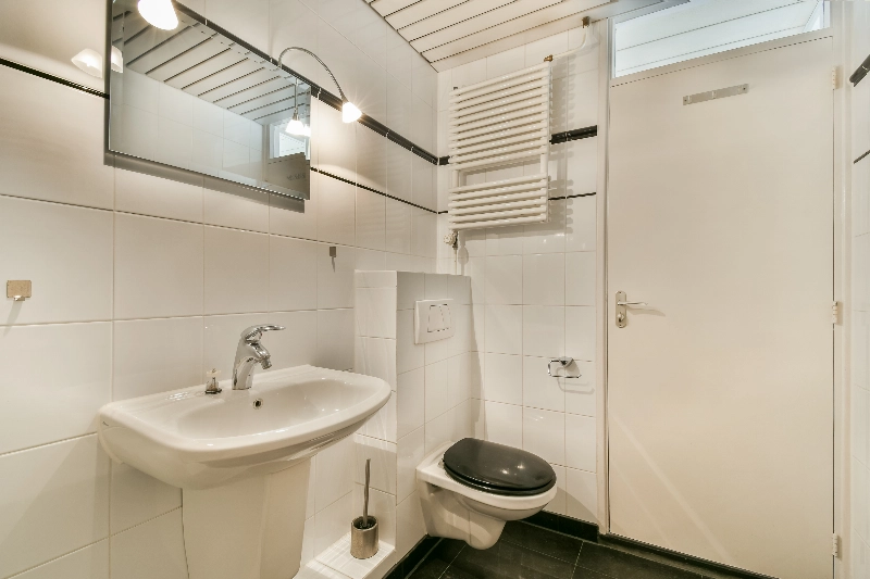 De badkamer is modern afgewerkt met wit/zwart tegelwerk en voorzien van een ruime douchehoek, een wastafel met spiegel, een kast, een radiator en een zwevend toilet.